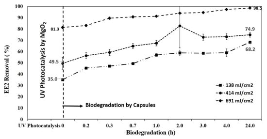AOP is an effective treatment, especially with respect to cleaving double bonds and rings []. Double bonds and ring cleavage are hard to challenge by biological digestive systems. Therefore, the observed synergy between the two systems (MgO2/LP-UV and biological) stems from the fact that the MgO2/LP-UV pre-treatment renders the EE2 molecules more susceptible to the biological systems, resulting in reduced biodegradation time. Biodegradation alone was only able to remove 61% EE2 in 4 h; however, when combined with the photocatalytic treatment, its contribution of biodegradation by SBP capsules decreased up to 24% (at the lower dose of 138 mJ/cm2). MgO2/LP-UV as the sole treatment presented 81% EE2 biodegradation at 691 mJ/cm2. Thus, the combined treatment offers a rapid-tech treatment potential that is only hinted at in this study. Research is needed to gather more evidence on combined physicochemical and biological treatments. It is essential to find the right combination of AOP and biological treatment, since the biotreatment requires less energy and cost investment.
