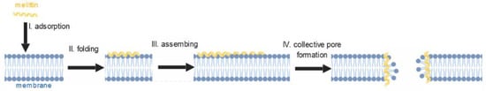 Xanthomonas oryzae has been demonstrated as a consequence of the interaction of MEL with the bacterial cell wall, leading to disruption of the cytoplasmic membrane by formatting channels and leakage of cytoplasm. The same study suggests that MEL may have the ability to bind the RNA or DNA in the cytoplasm leading to bacterial cell death. The antiviral activity of this peptide has been proven in an influenza virus model. MEL displays virucidal activity, disrupting viral envelopes [