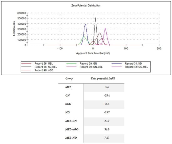 Zeta potential of nanoparticles, MEL, and complexes colloids was measured by the laser dynamic scattering-electrophoretic method with Smoluchowski approximation using a Zetasizer Nano ZS, model ZEN3500 (Malvern Instruments, Malvern, UK). Each sample was measured after 120 s of stabilization at 25 °C. Nanoparticles were sonicated for 30 min and the zeta potential was immediately measured. The zeta potential of the complexes was measured immediately after 15 min incubation of MEL with nanoparticles.
