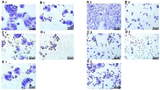 After 24 h of exposure to the MEL and MEL–nanoparticles complexes, the medium was removed, the cells were stained using the May–Grünwald–Giemsa (Sigma-Aldrich) method, and their morphology was investigated using a CKX 41 light microscope (Olympus, Tokyo, Japan). Images were captured using a ProgRes c12 camera (Jenoptik, Jena, Germany). Cells cultured without the addition of MEL–nanoparticles or MEL, but with the same volume of media, were used as the control group.
