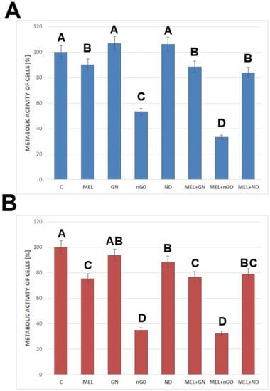 Pure MEL peptide was obtained from Sigma-Aldrich (purity ≥85%; Munich, Germany) in a powder form and was dissolved in ultrapure water. GN (thickness: 6–8 nm; purity >99.5%) and ND (thickness 3–4 nm; purity >95%) powders were purchased from the SkySpring Nanomaterials (Houston, TX, USA) and nGO (thickness <2 nm; purity 98%; diameter: 8–15 um) powders were purchased from Institute of Electronic Materials Technology in Warsaw, Poland. To select the concentrations for the study on complexes, the viability (XTT test) and mortality (PrestoBlue test) of breast adenocarcinoma cells (MCF-7 and MDA-MB-231) were measured for five different concentrations of hydrocolloids of each nanoparticles (5, 10, 20, 50, 100 mg/L), MEL (1, 2, 5, 10, 20 mg/L) and the control. Cells cultured without the addition of nanoparticles or MEL, but with the same volume of media, were used as the control group.