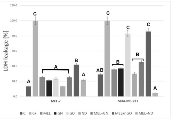 A test checking the integrity of the cell membranes and the outflow of LDH to a medium that, under physiological conditions, is located inside a cell, gave divergent results for cell lines. For MCF-7 only MEL-nGO complex caused a higher level of LDH in the culture medium compared to the MEL-treated group, which implied a stronger destruction of the cell membrane. Interestingly, the nanoparticle itself in the same concentration as in the complex did not show significant differences compared to the control, or to the rest of the studied groups. In turn, for the MDA-MB-231 line, the nGO and MEL-nGO treated group were in the same homologous group as the group treated with 2% triton X solution, which caused 100% membrane degradation. This suggests that MDA-MB-231 is more sensitive to nGO than the MCF-7 cell line. Whereas, the use of ND as MEL carrier for the MDA-MB-231 group resulted in a smaller LDH efflux compared to MEL and a control group. These results indicate that ND can protect MDA-MB-231 cells against the lytic effects of MEL. Study performed with graphitic and oxidized at high pressure and temperature ND on MCF-7 and MDA-MB-231 cell lines demonstrated that MDA-MB-231 cells showed lower uptake of both ND forms that is related to internalization by clathrin-mediated endocytosis and a high expression of clathrin protein in MCF-7 cells [