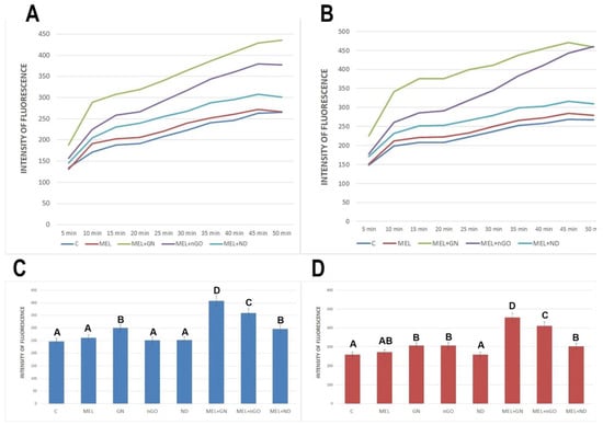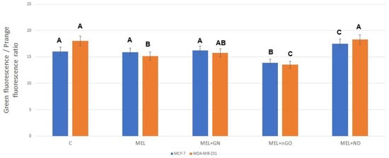 For the MDA-MB-231 line, all test groups, except the ND-treated group, caused a significant increase in the level of intracellular ROS. MEL complexes with GN and nGO caused the greatest increase in ROS among all the studied groups for both cell lines. According to scientific reports, ROS has a different role in cancer development depending on the stage of cancer. A decrease in the level of antioxidants and an increase in ROS production supports the process of neoplastic formation in the early stages of cancerogenesis. This induces oxidative damage and mutations in suppressor genes and pro-oncogenes. In advanced stages of cancer, cells often produce high levels of antioxidants to avoid cell death [