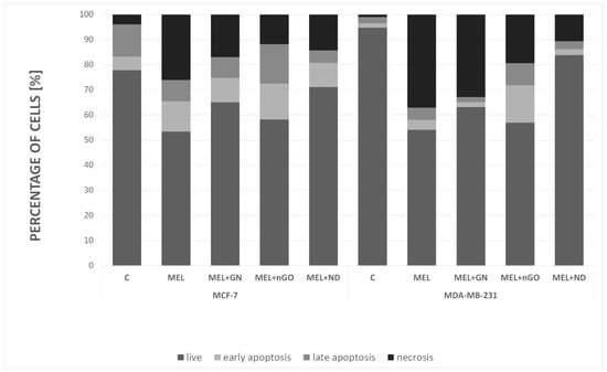 MDA-MB-231 cells were seeded at 2 × 105 cells per well in six-well plates and cultured until 70–80% confluence. After 24 h, the medium was removed and hydrocolloids of complexes (MEL-GN, MEL-ND) and MEL were introduced to the cells. The control sample consisted of cells cultured without the addition of MEL and nanoparticles. After 24-h incubation with MEL and complexes, the cells were trypsinized, harvested, and washed with cold phosphate-buffered saline containing calcium and magnesium ions. After rinsing and centrifugation, each cell pellet was suspended in 100 μL of annexin-binding buffer. Then, 5 μL of FITC-labeled annexin V and 1 μL of propidium iodide (PI) were added to each cell suspension. The cells were incubated at 25 °C for 15 min. Then, 400 μL annexin-binding buffer was added to the cell suspensions, gently mixed, and stored on ice until introduction into the flow cytometer. A total of 10,000 events were recorded per sample. Plots were generated using Flowing Software 2.5.1 (Perttu Terho, Turku, Finland). Fluorescence emission intensity was measured using two FL1 channels for FITC at Em = 530 nm and FL2 for PI at Em > 570 nm.