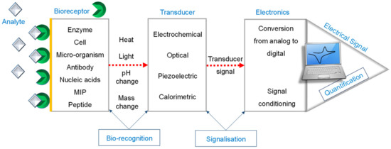 The International Union of Pure and Applied Chemistry (IUPAC) defines a biosensor as “a device that uses specific biochemical reactions mediated by isolated enzymes, immunosystems, tissues, organelles or whole cells to detect chemical compounds usually by electrical, thermal or optical signals” [9]. These analytical devices convert a biological or chemical response into an electrical signal and are usually classified on the basis of the type of bioreceptors involved in bio-recognition events, i.e., enzyme [10], antibody [11], peptide [12], aptamer [13], DNA [14], and molecularly imprinted polymer (MIP)-based sensors [15,16], or according to the type of transducer employed, such as electrochemical [17], optical [18], piezoelectric [19], and calorimetric biosensors [20]. The general working principle behind all of the biosensors is portrayed in Figure 1. Amidst these sensors, the one with antibody as a bio-recognition element is one of the most important and widely studied sensing platforms. Such platforms are often termed as immunosensor, since they function on the basis of immunoreaction (i.e., specific recognition) between antigens and antibodies [21,22]. They can meet the needs of specific and rapid identification of the bio-recognition molecules, as well as the on-line and real-time detection requirements of modern analytical procedures. Therefore, immunosensors can offer a broader platform for research and development.