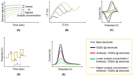 (A) Amperometric curves for the different concentrations of target analyte. (B) Nyquist plot: Change in the impedance upon electrode functionalization and analyte addition. (C) Cyclic voltammogram of a GQD-coated electrode, where its electrochemical response varies upon the specific binding of antibody to analyte. (D) Potential time profile of square wave voltammetry (SWV), where E1: Initial potential; E2: Potential after pulse; f: Pulse frequency; t: Pulse duration. (E) Representation of the analyte detection by means of GQD-coated electrodes, where the variation in current is proportional to the antibody occupancy.