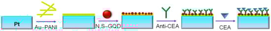 Carcinoembryonic antigen (CEA) is one of the major tumor markers associated with the diagnosis and controlling of malignant tumors, such as pancreatic, colorectal, lung, liver, breast, and gastric cancers [113,114,115,116,117,118]. It is an oncofetal glycoprotein with a molecular weight of 180–200 kDa [119], which is generally expressed by mucosal cells and overexpressed by various malignancies [120,121]. Elevated level of CEA in human blood (>5 ng mL−1) is an indication of cancer cell formation [116]. Very recently, Ganganboina et al. developed a label-free impedimetric immunosensor based on nitrogen- and thiol-doped GQDs (N,S–GQDs) and gold-embedded polyaniline (Au–PANI) nanowires for the ultrasensitive and extremely selective detection of CEA [122]. The excellent electro-conductivity of N,S–GQDs/Au–PANI nanowires enhance the electron transfer. Figure 6 shows the immobilization of N,S–GQDs onto the Au–PANI surface via Au–thiol linkage after depositing Au–PANI onto the Pt electrode. N,S–GQDs act as the bifunctional probe to link anti-CEA and to amplify the electrochemical activity. The detection principle of CEA was based on the change in impedance of N,S–GQDs/Au–PANI after the introduction of CEA, suppressing the electron transfer after the conjugation of antibody–antigen on the N,S–GQDs/Au–PANI surface. This label-free immunosensor displays a wide linear range from 0.5 to 1000 ng mL−1, with a limit of detection (LOD) of 0.01 ng mL−1.