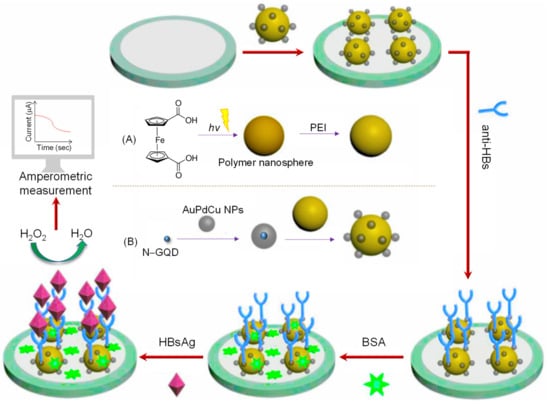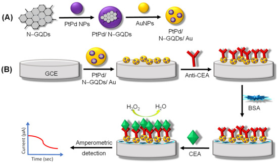 Another label-free immunosensor for the quantification of CEA based on PtPd/N–GQDs/Au functionalized glassy carbon electrode (GCE) was fabricated by Yang et al. in 2017 [67]. Preparation of PtPd/N–GQDs/Au via a self-assembly approach due to covalent binding is depicted in Figure 7. The synergistic effect of nanocomposites in PtPd/N–GQDs/Au provide the electro-catalytic activity towards hydrogen peroxide (H2O2) reduction, good biocompatibility, excellent conductivity, and large surface area; thus, PtPd/N–GQDs/Au was employed as transducer to effectively immobilize capture antibodies and to serve as a signal amplification platform. The specificity of this sensor was investigated against non-specific biomolecules like hepatitis B surface antigen (HBS), prostate specific antigen (PSA), human immunoglobulin (IgG), and BSA, whereas the variation in amperometric response of these samples with interference and CEA was found less than 5% of that without interferences, suggesting that the designed immunosensor is highly selective. This label-free amperometric immunosensor could attain high sensitivity and long-term stability for the detection of CEA, with a linear calibration plot ranging from 5 fg mL−1 to 50 ng mL−1, and the LOD was found as 2 fg mL−1.