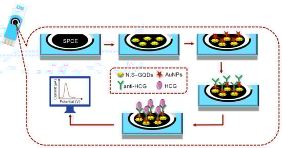 In 2019, Roushani and Valipour constructed an economic, facile, and label-free electrochemical immunosensor for the accurate and selective quantification of human chorionic gonadotropin (HCG) in human serum [61]. The N,S–GQDs, as well as AuNPs, were casted one after the other on SPCE, as illustrated in Figure 8. This modification not only increased the antibody loading, but also improved the electrochemical signal for protein analysis, thereby effectively enhancing the sensitivity of the sensor. In order to electrochemically characterize the surface modifications, the electrode was submitted to CV and EIS techniques, whereas DPV was used for the quantification of HCG by scanning the potential of −0.1 to 0.5 V. To study the reproducibility of the proposed sensor, the inter-assay, as well as intra-assay, precisions were performed for the same HCG levels with five measurements. As a result, the relative standard deviations (RSDs) were found to be 2.9% and 3.5%, respectively. This suggests that the N,S–GQD/AuNP-modified SPCE has a wide potential window with good reproducibility.