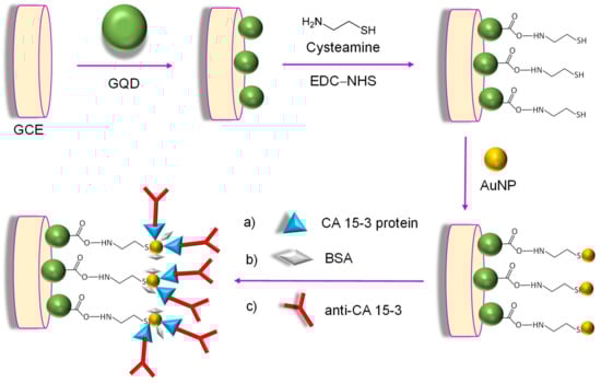 The same research team has also reported a label-free immunoassay for the accurate quantification of a breast cancer-specific protein, CA 15-3 [126]. In this approach, modification of GCE surface was initiated by electrochemically assembling the AuNPs onto thiolated graphene quantum dots using cysteamine (CysA), as well as 1-Ethyl-3-(3-dimethylaminopropyl)-carbodiimide (EDC) and N-hydroxysuccinimide (NHS). The subsequent CysA/AuNPs/GQDs hybrid interface provided stability and large loading of CA 15-3 molecules for their effective immobilization, thereby increasing the number of binding events occurring between the antigen and antibodies (Figure 9). The sensor fabrication, as well as the immunoreaction, were investigated by CV and SWV techniques, where the drop in the SWV peak current of [Fe(CN)6]3−/4− was attributed to the response of the CA 15-3 antibody binding to the sensor. The prepared device can be applied to CA 15-3 malignant cell line lysates (human breast adenocarcinoma cell line-MCF-7) for breast cancer diagnosis.