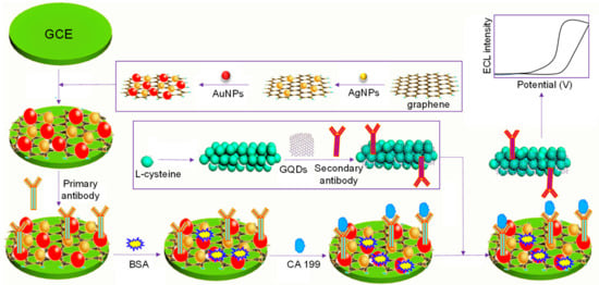 Yang and coworkers assembled an ECL immunosensor by modifying a GCE surface for the selective determination of carbohydrate antigen 199 (CA 199), a potent tumor marker in diagnosing pancreatic cancer [129]. As indicated in Figure 10, the fabrication process involved the integration of a sensor surface using gold–silver nanocomposite-functionalized graphene (GN–Ag–Au) and porous PtPd nanochain-implanted GQDs (PtPd–GQDs). Owing to the favorable physical and chemical properties exhibited by these hybrid nanomaterials, GN–Ag–Au provided a large surface area to capture a huge number of primary antibodies and boosted the electronic transmission rate, while PtPd–GQDs delivered a large loading of secondary antibodies. This sandwich assay led to an improved sensitivity, achieving a broad detection range (0.002–70 U mL−1) and LOD of 0.96 mU mL−1 CA 199 concentration in human serum. Further, the authors reported that this biosensor was able to retain almost 96% of its initial activity, even after 7 weeks, and therefore has long-term stability, which could be attributed to the excellent biocompatibility of GQDs, as well as the strong bonding between secondary antibodies and PtPd–GQDs.