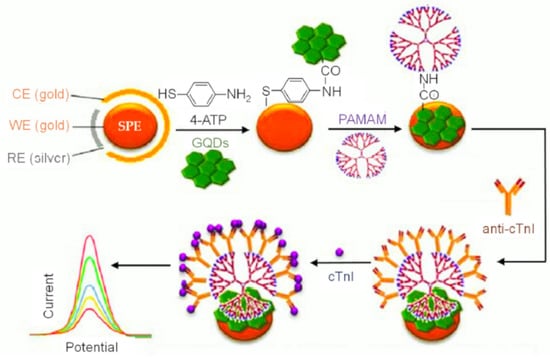 In 2017, Bhatnagar et al. designed an ultrasensitive electrochemical immunosensor for the rapid sensing of cardiac troponin I (cTnI), a biomarker responsible for heart attack (myocardial infarction) in humans [137]. In this study, screen-printed gold electrode (SPGE) was embedded with a linker molecule 4-aminothiophenol (4-ATP) for amine termination of the electrode surface, and these amino groups were further coupled with carboxyl groups of GQD via EDC/NHS reaction. In order to enhance the sensitivity of the device, polyamidoamine (PAMAM) dendrimer was consecutively decorated on GQD through carbodiimide coupling. These hybrid nanomaterials act as gold electrode modifier to offer an ultra-high surface area for antibody immobilization. The activated cTnI monoclonal antibody was then mounted on PAMAM to form nanoprobe for sensing cTnI antigen (Figure 12). The recognition of cTnI was monitored by decrease in the [Fe(CN)6]3− oxidation peak using cyclic voltammetry (CV) and differential pulse voltammetry (DPV), achieving a lower LOD of 20 fg mL−1 and a broad concentration range of cTnI (10−6–10 ng mL−1). Moreover, the as-prepared sensor was claimed to detect cTnI in human blood serum within 10 min.