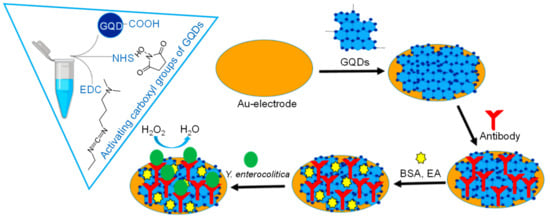 Steps involved in the development of a GQD-based immunosensor for Y. enterocolitica detection [63].
