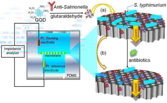 - Ye, W.; Guo, J.; Bao, X.; Chen, T.; Weng, W.; Chen, S.; Yang, M. Rapid and sensitive detection of bacteria response to antibiotics using nanoporous membrane and graphene quantum dot (GQDs)-based electrochemical biosensors. Materials 2017, 10, 603. [Google Scholar] [CrossRef]