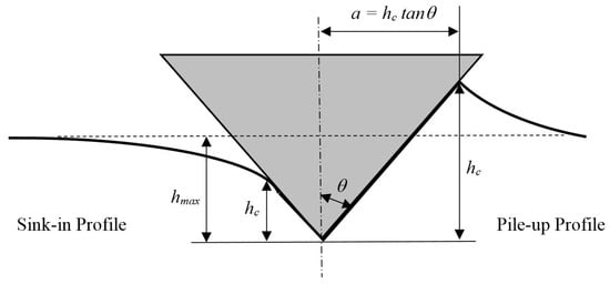 Nanoindentation is a commonly used technique to investigate submicron or nanoscale mechanical material properties such as elastic modulus (E) and hardness (H). These properties can be deduced from the load-unload curve using a popular method proposed by Oliver and Pharr [,], also known as the Oliver and Pharr method. Central to the Oliver and Pharr method is the determination of the projected area from the surface formed by the indenter’s impression, also referred to as the contact area. Determining the indentation’s impression area is a complex process where analytical solutions are difficult to obtain due to its dependence on the material’s elastic and plastic behaviour [,]. The original Oliver and Pharr method relies on the elastic-contact analytical solution first introduced by Sneddon [], who described the shape of an indentation impression using a solid revolution of a nonlinear function. As a result, the Oliver and Pharr method generally apply well to material that has a sink-in contact profile, where the contact point between indenter and material is lower compared to that of the original material surface. However, for the same reason, it is unclear how well the Oliver and Pharr method can be used for material that exhibits a pile-up profile, where the contact area between indenter and material is higher than that of the original material surface. Both the sink-in and pile-up contact profiles are illustrated in Figure 1.