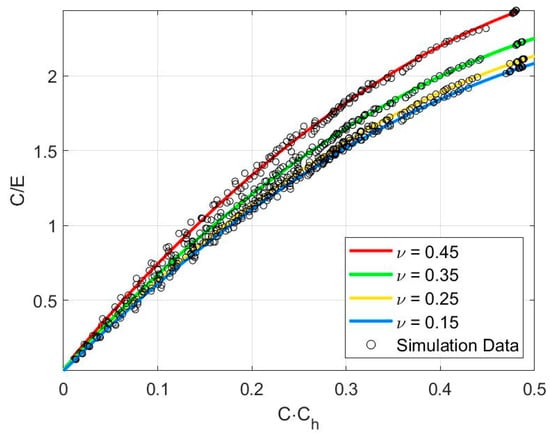 For the equivalent cone angle of 70.3°, a relationship for C/E and C·Ch was found with varying Poisson’s ratio (ν), as shown in Equation (13) and plotted in Figure 3. The relationship between C/E and C·Ch was found to be independent of work hardening. We chose to use a power-law function to represent this relationship, which allows the incorporation of Poisson’s ratio (ν) as a parameter to improve estimation accuracy. With both known values of the loading coefficient (C) derived from Equation (3), and the stiffness–depth coefficient (Ch) derived from Equation (13), Equation (13) can be obtained for the elastic modulus (E). Equation (13) is plotted in Figure 3, showing the variation of Poisson’s ratio.