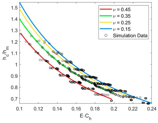 Once the elastic modulus (E) was determined, contact depth (hc) could be calculated from Equation (14) by substituting Poisson’s ratio (ν), maximum indentation depth (hm), and stiffness–depth coefficient (Ch) derived from Equation (1). Results are shown in Figure 4, with varying Poisson’s ratios (ν).