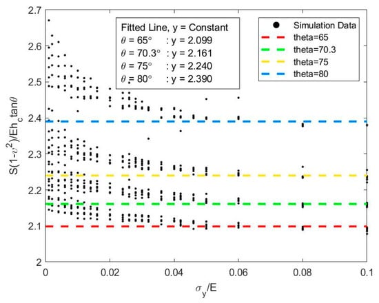 The relatively high contact depth derived by the Cheng and Cheng method using Equation (15) may be explained by taking a closer look into the way this equation is derived. Equation (15) shows that the relationship of and σy/E is constant when it is taken with a wider range of 0 < σy/E < 0.5. However, a closer look reveals that the value of has a widespread when σy/E < 0.1, as shown in Figure 5, for different equivalent cone angles (θ). To consider the data spread, a mean value was taken for the range of 0 < σy/E < 0.5 and resulted in a higher value ranging from 2.1 to 2.4. Furthermore, by using the methodology proposed in this work, the calculated σy/E was lower than 0.1 for both aluminum (0.0002) and steel (0.0006). Due to this, the deduced value proposed by Cheng and Cheng [] would be even higher compared to the deduced mean value shown in Figure 5. Comparing the hc/hm ratio obtained in this work and those proposed by Cheng and Cheng [], the higher value obtained using the Cheng and Cheng method should be reduced by adopting a higher mean value for σy/E < 0.05. In the case of the equivalent cone angle θ = 70.3°, the reduction of the hc/hm ratio using the data in Figure 5 was estimated as 12%, which brings it closer to the hc/hm ratio determined in this work. With this adjustment, it further verifies that the proposed relationship presented in this work is in line with the values proposed by Cheng and Cheng [].