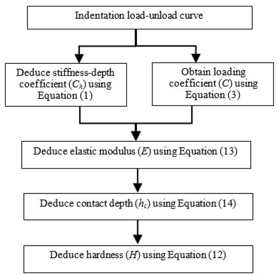 A flowchart is presented in Figure 6 to illustrate the procedure for obtaining stiffness-based relationships. This proposed procedure is effectively a reverse algorithm to determine the respective elastic modulus and hardness based on a given load-unload curve. This proposed algorithm is only applicable for a Berkovich indenter with an equivalent cone angle of 70.3°.