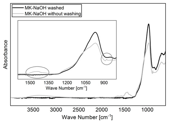 FTIR spectra of dried MK-NaOH after and without prior washing the sample. The carbonization of adhered NaOH to the particle surfaces can be avoided by washing the sample.