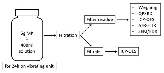 The filtrate was acidified with concentrated HCl to a pH of 1 and filled up to 500 mL in a volumetric flask with distilled water, ready for ICP-OES analysis. A schematic summary of the experimental program is shown in Figure 2.