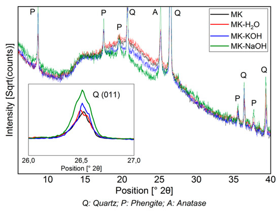 Figure 3 shows the diffractograms of the filter residues. For the sake of a clearer overview, the MK-MOH measurement is not given. The intensity is expressed as a square root of the counts and the peaks of the crystalline phases are partially cut off. This emphasizes the changes in the X-ray amorphous hump. The diffractograms MK and MK-H2O are almost congruent. Thus, no structural change can be detected when the sample (MK) is treated with distilled water (MK-H2O). With MK-KOH, a slight decrease in the X-ray amorphous hump and a slightly higher maximum intensity of the peaks in the crystalline phases can be observed. This trend becomes more pronounced with MK-NaOH and leads to clearly discernible differences between MK and MK-NaOH. The increase in the intensity of the peaks of the crystalline phases is clearly visible at the (011)-reflex of the quartz, which is highlighted in the enlarged insert displaying a range from 26–27° 2Θ (Figure 3).