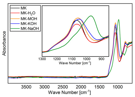 The FTIR spectra of MK and residues analyzed are shown in Figure 4. As reported elsewhere [45,55,56], a broadened band is visible in the region of Si-O vibration (900–1200 cm−1), owing to amorphization of the crystalline kaolinite structure. Special attention will be paid to this band (zoomed region in Figure 4 from 850 to 1300 cm−1). As expected, MK and MK-H2O behave similarly, and no differences can be found within the range of reproducibility of the measurements. With MK-MOH and MK-KOH, a slight shift in the band to smaller wave numbers and a broadening of the peak can be observed. MK-NaOH leads to a clear shift in the band to smaller wave numbers. Table 8 summarizes the determined wave numbers and the corresponding full width at half maximum (FWHM).