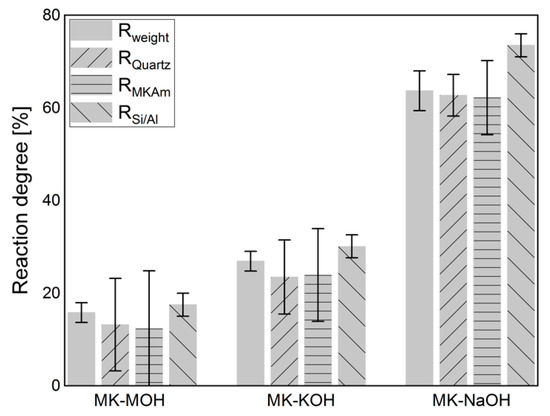 Figure 6 displays the results of the calculations of the degree of reaction based on the weighing of the filter residue (Table 4), the QPXRD (Table 5) and the Si/Al-solubility (Table 6). The calculation of the degree of reaction of Rweight (Equation (1), Section 2.6) considers the crystalline phases in comparison to the weighing of the filter residue (Table 4). The differences in mass are related exclusively to the X-ray amorphous fraction and thus reflect the mass loss in percent. Since errors in the quantification of one phase do not affect the quantification of another phase when calculating the phase contents following the G-factor method [48,57], the degree of reaction was determined from both the quantification of the quartz and of the MKAm. An increase in the degree of reaction from MK-MOH via MK-KOH to MK-NaOH can be observed. In all systems, the degree of reaction calculated from the Si/Al-solubility is the highest, while the degrees of reaction calculated from XRD quantifications are the lowest. For the calculation of the degree of reaction from the results of the XRD quantifications (RQuartz and RMKAM) a large error in the degrees of reaction occurs. This effect is particularly pronounced with MK-MOH and MK-KOH due to higher error propagation at lower reaction rates. Thus, for MK-NaOH the error in the degree of reaction is significantly lower. This is in line with observations in the literature, which also find a large error in the degree of reaction calculated from XRD quantifications for low reaction rates or low SCM contents [26,36]. Another reason for the large errors in the degree of reaction calculated from the XRD quantifications results from the experimental setup, as the degree of reaction does not reflect the decrease in MKAM in the sample. A degree of reaction of 12.3% (MK-MOH) only leads to a difference in MKAM of 0.9 wt.% and thus to large errors in the calculated degree of reaction based on XRD quantifications of MKAM with an accuracy of ±1 wt.%. Due to the strong error propagation from the XRD quantifications, the data obtained must be interpreted with caution. This is also known from the calculation of the degree of reaction with results of other test methods which exhibit small deviations of the determined contents. Scrivener et al. [58] report, for instance, a possible relative error of ±50%, when calculating the degree of reaction from the CH consumption determined by TG. The absolute differences in the degree of reaction (ΔR) increase with increasing degree of reaction, while the relative differences (ΔR/Rmax) decrease (Table 9).