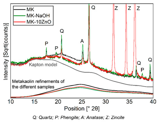 Comparison of diffractograms of MK-NaOH and a MK sample mixed with 10 wt.% ZnO as internal standard. The scattering contribution to the diffractogram of MKAm of the different samples and of the Kapton model is shown.