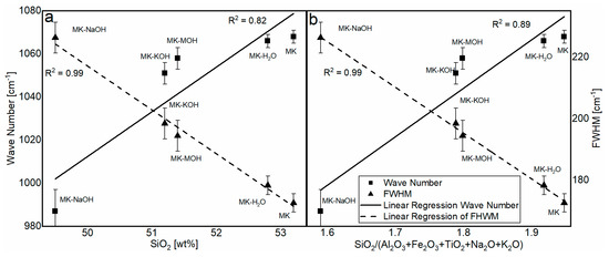 Correlation of the SiO2 content (a) and the molar ratio of SiO2/(Al2O3 + Fe2O3 + TiO2 + Na2O + K2O) (b) in the aluminosilicate structure with the wavenumber and FWHM.