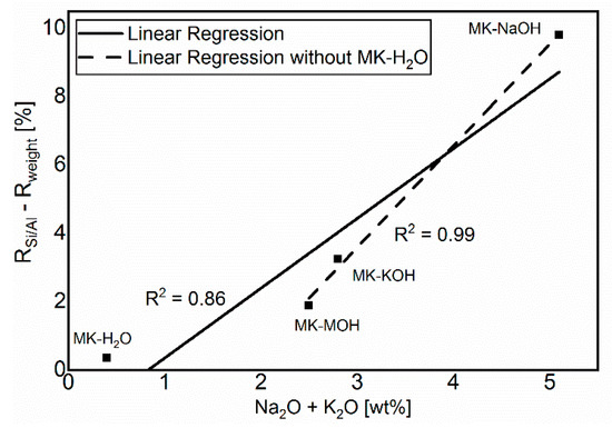 The comparison in Figure 6 of Rweight and RSi/Al shows a lower degree of reaction for Rweight. The difference is due to the uptake of alkalis in MKAm. The additional alkalis lead to a higher weight of the filter residue than calculated from the Si/Al-solubility only, and thus to a lower degree of reaction based on Rweight in comparison to RSi/Al. Consequently, the deviations between the two degrees of reaction increases with increasing alkali uptake. This relationship is illustrated in Figure 9. MK-H2O is somewhat out of the range, because, on the one hand, the degree of reactions and thus the measurable effects are very low and, on the other hand, no alkalis are available for uptake in the distilled water. Without MK-H2O, the correlation fits very well and confirms the aforementioned.