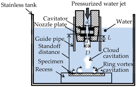 Figure 2 shows a schematic diagram of the peening section of the cavitation peening system. In the present experiment, a submerged high-speed water jet was used to generate cavitation. The high-speed water jet was pressurized by a plunger pump, with a maximum working pressure of 30 MPa and maximum flow rate of 3 × 10−2 m3/min and injected into a chamber filled with water. The injection pressure was controlled by the rotational speed of the invertor motor of the plunger pump. When the high-speed water jet was injected into the chamber, cloud cavitation was generated inside the nozzle and/or in the shear layer around the jet. A submerged jet with a cavitation bubble is called a cavitating jet []. On the impinging surface, cloud cavitation became a ring vortex cavitation, then collapsed. Thus, the area treated by the fixed cavitating jet shows an annular shape [], and the scanning cavitating jet can treat the surface uniformly []. In the present paper, the specimen, which was put in a recess to make a flat surface, was placed perpendicular to the jet in the chamber. The specimen was treated by scanning the nozzle, which moved horizontally at a constant speed v. The throat diameter of the nozzle was 2 mm. As the cavitator and the guide pipe can enhance the aggressive intensity of the cavitating jet [], both of them were installed in the nozzle. The diameter of the cavitator was 3 mm, which was optimized in a previous study []. As the geometry of the outlet bore at the nozzle affects the aggressive intensity of the cavitating jet, the length L and the diameter D of the bore were optimized as L = 16 mm and D = 16 mm []. As the cavitating flow was separated at the upstream corner of the nozzle, the standoff distance s was defined by the distance from the upstream corner of the nozzle to the surface of the specimen. When the specimen is set too close to the nozzle, even though there is the cavitating jet, the specimen is treated by water jet peening, in which water columns peen the target. The classification map, in which cavitation peening and water jet peening were classified using the normalized standoff distance and cavitation number, was proposed []. The standoff distance chosen in the present experiment was s = 222 mm, which was the same in a previous report [], and this was the cavitation peening condition.