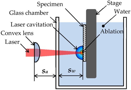 Figure 3 shows a schematic diagram of the peening section of the laser peening system. In the present experiment, a submerged laser peening system was used. In most cases, in conventional submerged laser peening, the second harmonic of the Nd:YAG laser (i.e., 532 nm in wave length), is used to mitigate the absorption of laser power due to water. As mentioned in the introduction, the impact at the collapse of the bubble, which is developed and collapses after laser ablation, is also affective for peening. In experimental studies of bubble dynamics, the fundamental harmonic of the Nd:YAG laser (i.e., 1064 nm) is used to harness the heat []. Soyama revealed that submerged laser peening, using a laser of 1064 nm in wave length, introduced compressive residual stress when the distances in air and water were optimized []. Thus, in this experiment, the wavelength of 1064 nm was used, which was the same in a previous report []. The pulse energy, beam diameter, pulse width, and repetition frequency of the used Q-switched Nd:YAG laser were 0.35 J, 6 mm, 6 ns, and 10 Hz, respectively. To minimize the damage to a glass chamber due to the laser, the laser was reflected by mirrors and expanded by a concave lens, then focused by convex lenses onto the specimen placed in the water-filled chamber, whose thickness was 3 mm. The length, width, and depth of the chamber were each 150 mm. The deionized water was fed into the chamber at about 5 × 10−3 m3/min to remove particles caused by the ablation. It should be noted that the water was degassed to minimize the cushion effect at the bubble collapse. The focal distance of the final convex lens was 100 mm. In order to minimize damage to the mirrors and lenses due to the reflection between the final convex lens and the chamber, the convex was placed as shown in Figure 3. In the present laser peening, the distances in air sa and in water sw were 84 mm and 19 mm, respectively, which was the same in a previous study []. In the present condition, the diameter of the laser spot on the specimen surface was about 0.8 mm. The specimen was placed on a stage, which was moved by linear stepping motors in the vertical and horizontal directions. The pulse density dL was controlled by the horizontal speed vs and the stepwise movement in the vertical direction sv using the stepping motors. As the repetition frequency was 10 Hz, dL was defined by Equation (2).