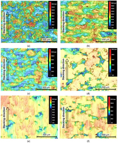 In order to investigate the effect of various peening methods on Ti6Al4V manufactured by DMLS and EBM, Figure 5 and Figure 6 show the aspects of specimens manufactured by DMLS and EBM, observed by a laser confocal microscope. In Figure 5 and Figure 6, the aspect and height data, which are revealed by the color map, from blue to red, were combined to clearly show the rough surface of AM Ti6Al4V. For both the as-built specimens manufactured by DMLS and EBM, a lot of un-melted particles are on the surface, and deep valleys, whose directions are perpendicular to the stacking direction, are shown. As the averaged diameter of the used particle for DMLS and EBM is 40 µm and 75 µm, respectively, the diameter particles on the DMLS surface are nearly half those on the surface of the EBM specimen. After cavitation peening and laser peening (see Figure 5b,c and Figure 6b,c), some particles were removed by impacts induced by the cavitation collapse and pulse laser. However, a lot of particles still exist on the surface. In the case of shot peening, the un-melted particles on the surface were deformed for both cases of DMLS and EBM, but deep valleys were still on the surface. As shown in Figure 5e, the deep valleys were not removed in the present grinding. In the case of cavitation peening after grinding, as shown in Figure 5f, the valleys are more remarkable. This is probably because the burrs generated by the grinding were cleaned by the cavitation impacts.