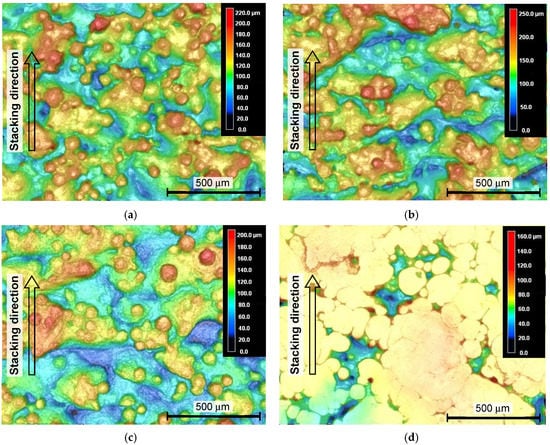 Aspects of the specimen manufactured by EBM, observed by a laser confocal microscope. (a) As-built; (b) cavitation peening; (c) laser peening; (d) shot peening.
