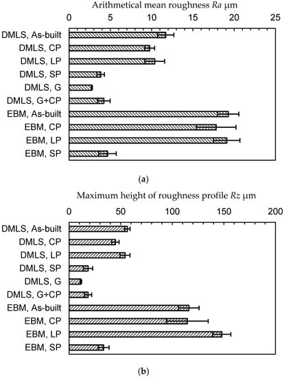 Surface roughness of the as-built Ti6Al4V manufactured by DMLS and EBM and the Ti6Al4V manufactured by DMLS and EBM through cavitation peening (CP), laser peening (LP), shot peeing (SP), grinding (G), and cavitation peening after grinding (G + CP). (a) Arithmetical mean roughness Ra. (b) Maximum height of the roughness profile Rz.