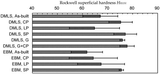 In order to compare the hardness of the specimens, the Rockwell superficial hardness HR15N is shown in Figure 8. As the surface of Ti6Al4V is very rough, the scatter band of HR15N in each case is relatively large. The hardness of the as-built DMLS specimen is HR15N = 67.1 ± 7.0, and this is slightly harder than that of the EBM specimen (i.e., HR15N = 61.8 ± 6.3). The HR15N of the DMLS specimen produced by cavitation peening was about 10% larger than that of the as-built Ti6Al4V, and the increment for the EBM specimen by cavitation peening was 4%. In the case of laser peening, HR15N was decreased in the DMLS specimen, and it was increased in the EBM specimen. This might be caused by local melting and local plastic deformation due to the pulse laser. In the case of shot peening, HR15N was increased in both the DMLS and EBM specimens. It should be noted that HR15N was affected by the surface profile, such as the skewness Rsk [], and the HR15N at Rsk < 0, as in the case of shot peening, was larger than that at Rsk > 0, even though the hardness was equivalent. Thus, the increment on HR15N by shot peening was caused by the work hardening and deformation of the surface. In any case, the peening treatments caused a work hardening effect on both the DMLS and EBM surfaces.
