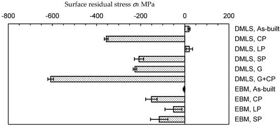 Surface residual stress of the as-built Ti6Al4V manufactured by DMLS and EBM and the Ti6Al4V manufactured by DMLS and EBM through cavitation peening (CP), laser peening (LP), shot peeing (SP), grinding (G), and cavitation peening after grinding (G + CP).