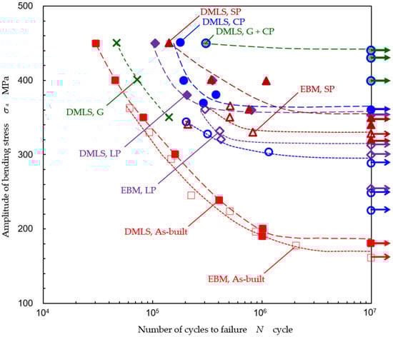 In order to reveal the fatigue properties of Ti6Al4V manufactured by DMLS and EBM, Figure 10 reveals the result of the plane bending fatigue test. The applied bending stress σa in Figure 10 was calculated by Equation (3) using δ, which was measured by the calipers. When the fatigue life and fatigue strength of the as-built specimen manufactured by DMLS and EBM were compared, those of the DMLS specimen were better than those of the EBM specimen. In the case of the DMLS specimen, the fatigue life at σa ≈ 450 MPa was improved by 10 times through cavitation peening after grinding, 5.9 times through cavitation peening, 4.7 times through shot peening, 3.5 times through laser peening, and 1.5 times through grinding, compared with the as-built specimen. The fatigue strength σf1 at N = 107 was calculated using Little’s method [], as shown in Table 1. The improvement ratio R1 in Table 1 means the ratio of the fatigue strength, compared with the as-built specimen, for each DMLS and EBM specimen. The ratio R2 in Table 1 shows the ratio between the fatigue strength of DMLS and EBM for each treatment. As shown in Figure 10 and Table 1, in the case of the DMLS specimen, the fatigue strength at N = 107 was improved by 1.97 times through cavitation peening, 1.93 times through laser peening, 1.92 times through shot peening, and 2.41 times through cavitation peening after grinding, compared with the as-built specimen. In the case of EBM, it was improved by 1.75 times through cavitation peening, 1.87 times through laser peening, and 1.95 times through shot peening. In sum, all treatments improved the fatigue strength, and the fatigue strength of the DMLS specimen was slightly better than that of the EBM specimen, as shown in Table 1.