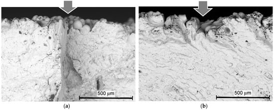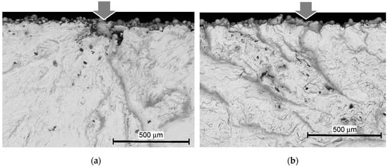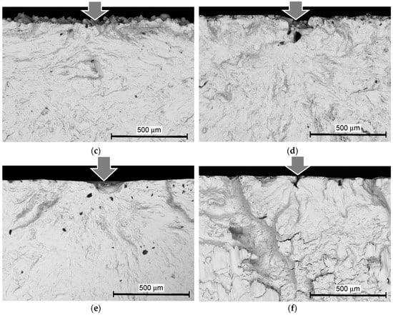 In Figure 11 and Figure 12, black arrows show the cracks that were produced by the fatigue, and white arrows show the cracks that existed before the fatigue test (see Appendix B). As shown in Figure 11a and Figure 12a, the cracks indicated by white arrows were observed on the surface of the as-built specimen, and they exist at the bottom of the valleys, which were orthogonal to the stacking direction. These cracks or steep valleys were produced during the AM process by layer-by-layer stacking. As shown in Figure 11b and Figure 12b, these steep valleys were opened by the cavitation attack. As the typical cavitation erosion pattern shows a jaggy pattern, the cavitation impact concentrates at the bottom of the dent. Thus, when the surface roughness was smoothed, the concentration of the cavitation impact was slightly reduced. This is a reason why the cracks at the bottom of the specimen treated by cavitation peening after grinding were fewer, compared with the specimen treated by cavitation peening without grinding. Thus, the fatigue strength of the specimen treated by cavitation peening after grinding was the best. As shown in Figure 11c and Figure 12c, the laser-peened surface was partially melted and oxidized on the surface. In the case of shot peening, the top of the un-melted particles was deformed, as shown in Figure 11d and Figure 12d. For both laser peening and shot peening, the cracks at the bottom of the valleys, indicated by white arrows, in the specimen, were similar to those of the as-built specimen. Moreover, the impacts produced by the pulse laser and shot collision did not open or close these cracks.