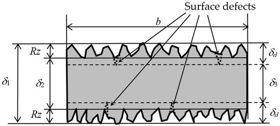 The fatigue strength σf1 in Table 1 was calculated with the thickness of the specimen, measured by the caliper as δ in Equation (3). In particular, the δ in Figure 15 was used as the δ in Equation (3). In the previous report, the core part δ and the surface roughness Rz were considered to calculate the bending stress, as shown Equation (4). Thus, δ was used as δ in Equation (3) []. In the present paper, the fatigue strength σf2, considering Rz, is shown in Table 2. As the core part is thinner than the thickness of the specimen, the increase of σf2, compared with σf1, was 3–9% for the DMLS specimen and 8–43% for the EBM specimen.