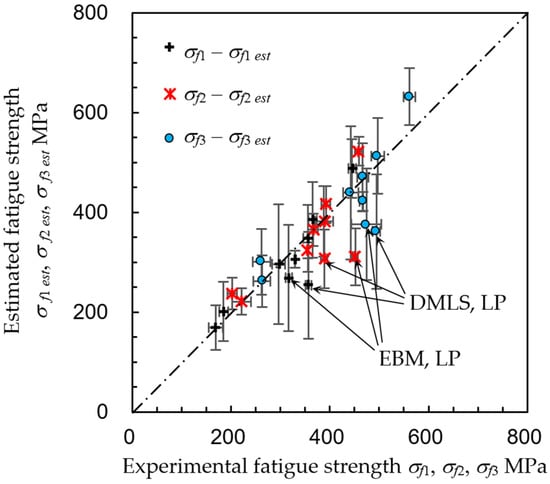 Here, a, b, and c are the constants calculated using the least squares method, and they reveal the contributions of the surface roughness, surface hardness, and residual stress, to the improvement of fatigue strength. The obtained constants are shown in Table 3, and the relationship between the experimental fatigue strength σf1, σf2, and σf3 and the estimated fatigue strength σf1 est, σf2 est, and σf3 est is shown in Figure 16. The error bars in Figure 16 were calculated from the standard deviation of the measured values (i.e., σf1, Rz, HRNT, and σR) using error analysis []. In Table 3 and Figure 16, the values of the as-built EBM specimen were used as the reference condition to estimate the fatigue strength. In the estimation, the residual stress of laser peening was −187 ± 11 MPa, as compressive residual stress was introduced in the near surface, although the surface was abraded by laser ablation. As shown in Figure 16, the relations between the experimental fatigue strength and the estimated fatigue strength for all three cases (i.e., σf1 − σf1 est, σf2 − σf2 est, and σf3 − σf3 est, are roughly on the line. These results show that the improved fatigue strength of the AM titanium alloy, enhanced by surface mechanical treatments, can be estimated from the fatigue strength of the as-built specimen by measuring the surface roughness, surface hardness, and surface residual stress of the treated one using Equation (6). Now, let us investigate the effect of the surface roughness, surface hardness, and surface residuals stress in the improvement of the fatigue strength. As mentioned above, although the surface roughness of the cavitation peened and laser peened specimens were scarcely changed, the fatigue strength was drastically improved by both peening methods. This means that the effect of the surface roughness was smaller than the others in the present study. This is why a is relatively smaller than b and c. When the absolute values of a, b, and c were compared, the absolute value of b was relatively larger than the others. In particular, the contribution of HR15N was relatively large, and the scatter band of HR15N was relatively large, as shown in Figure 8. Thus, the scatter band of the estimated fatigue strength was relatively large, as shown in Figure 16. As the compressive residual stress (i.e., negative value) enhances the fatigue strength, c is negative. As shown in Table 3, the absolute value of c was 0.34 for σf1 − σf1 est, 0.38 for σf2 − σf2 est, and 0.39 for σf3 − σf3 est. As the plane bending fatigue test was used in the present study, and the maximum bending stress was applied at the surface, the fatigue strength was improved by 34–39% of the introduced compressive residual stress. As shown in Figure 16, the laser peening points for both the DMLS and EBM specimens are slightly further than the others, as the measured work hardening was not so large, compared with the other treatments. The correlation coefficient between the experimental fatigue strength and the estimated value was 0.896 for σf1 − σf1 est, 0.766 for σf2 − σf2 est, and 0.823 for σf3 − σf3 est. As the number of the dataset was nine in the present study, the probability of a non-correlation is less than 0.1% for σf1 − σf1 est, 1.6% for σf2 − σf2 est, and 0.6% for σf3 − σf3 est. When the probability of a non-correlation is less than 1%, it can be concluded that the relationship is highly significant. Thus, it can be concluded that the relationship between the experimental fatigue strength and the estimated fatigue strength is highly significant. In particular, the improved fatigue strength treated by the present post-processing can be estimated by the surface roughness, surface hardness, and surface residual stress.