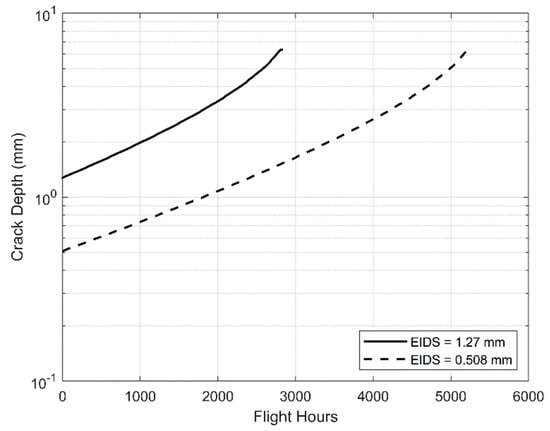 - Adopting the initial flaw assumptions, termed Equivalent Initial Damage Sizes (EIDS) in both Mil-STD-1530D [] and the Joint Services Structural Guidelines [], that as per [] when performing a durability analysis for a life limited part an EIDS of at least 0.02 inch (0.508 mm). Here, it should be noted that EZ-SB-19-01 [] and MIL-STD-1530D [] adopt the definition of EIDS given in [], viz: as an analytical characterization of the initial quality of the aircraft structure at the time of manufacture, modification, or repair. As such, the EIDS is not necessarily the physical size of the associated material discontinuity; see [,,,] for more details.