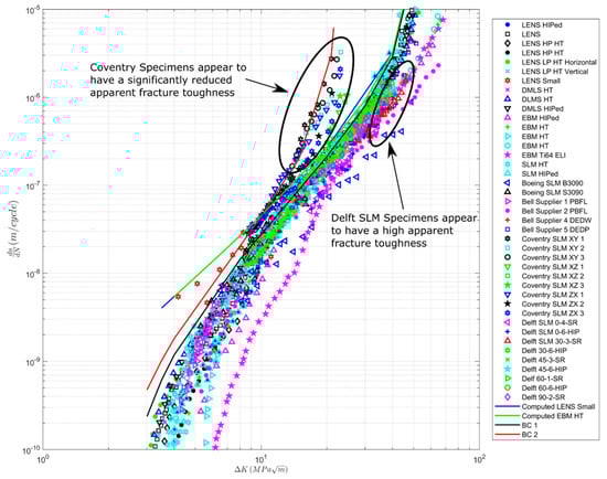 We also see that the curve BC2 appears to represent an upper bound on the tests reported in [], and hence on all of the various AM Ti-6Al-4V da/dN versus ΔK curves. On the other hand, the curve BC1 appears to represent an approximate upper bound on all the tests other than the SLM tests reported in []. We also see that the scatter in the various curves is greater at high values of da/dN than for values near the fatigue threshold. This finding is consistent with that discussed in [].