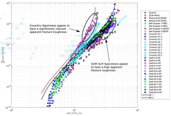 Examining Figure 2, we see that SLM specimens have the most significant difference in the cyclic fracture toughness, with those specimens reported in [] having the smallest value and those specimens reported in [] having significantly larger toughness’s. Indeed, the cyclic fracture toughness associated with the tests reported in [] were similar to those seen by Bell Supplier 2, who used Powder Bed Fusion Laser (PBFL).