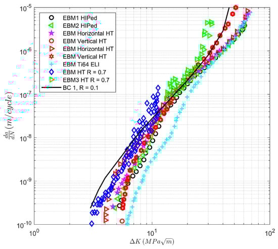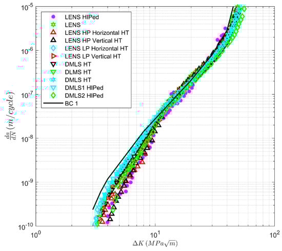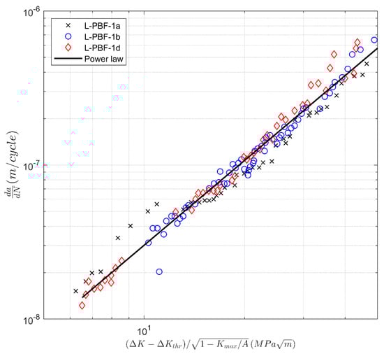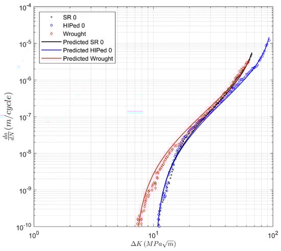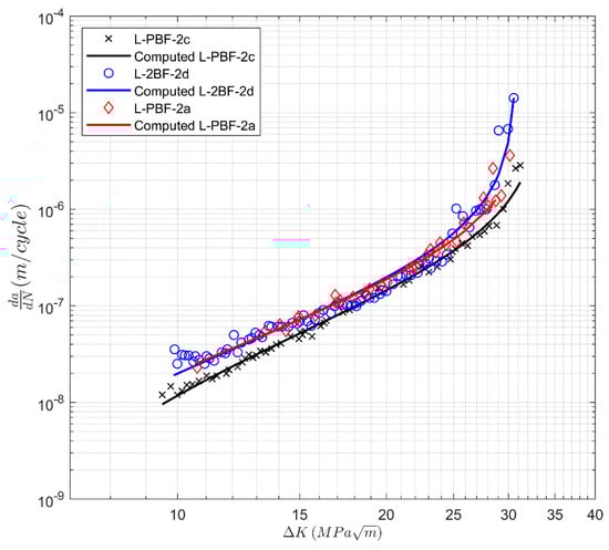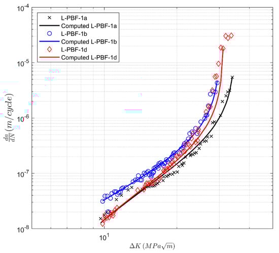 The da/dN versus ΔK curves for heat-treated laser powder bed fusion 17-4 PH stainless steel specimens tested in the 0° (Set 1) direction from []. This particular way of plotting collapses the computed curves into a single power law curve.