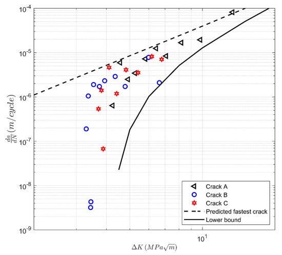 and, as per [,,,,], to obtain an estimate of the crack growth rate related to the fastest-growing crack [] set ΔKthr = 0.1 MPa √m. This curve is also presented in Figure 6. In addition, Figure 6 contains the curve obtained using Equation (3) together with ΔKthr = 4.2 MPa √m. Thus, it would appear that the results presented in Figure 6 support the hypothesis presented in [] that Equation (3), with the appropriate fracture toughness term (A), yields reasonable first approximations for the da/dN versus ΔK curve and the variability in the crack growth curve related to the fastest-growing crack.