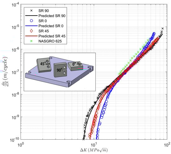 It should be stressed that the findings discussed in Section 3 are specific to AM Ti-6Al-4V, and in particular, to the various AM processes analyzed. For example, unlike the data analyzed above, the R = 0.1 da/dN versus ΔK curves related to crack growth in stress relieved (SR) AM Inconel 625 [] show a dependency on the build direction; see Figure 7. (Figure 7 also shows the da/dN versus ΔK curve, which is a conventionally manufactured (wrought) Inconel 625 taken from the NASGRO database).