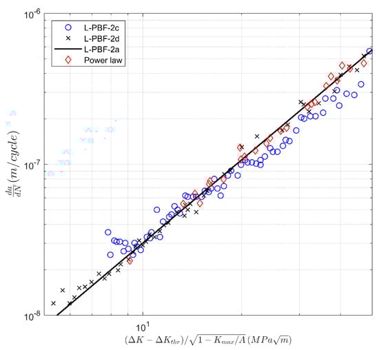 Crack growth curves for heat-treated laser powder bed fusion 17-4 PH stainless steel specimens tested in the 0° direction (Set 1) from []. The three last points of L-PVF-1d were not considered in the curve fitting.
