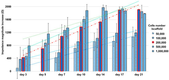Measurements after cell seeding were realized at specific time points (3, 7, 10, 14, 17 and 21 days), monitoring the variation of both impedance magnitude and phase angle during cell adhesion and growth with respect to frequency. Measured spectra were analyzed over all the range of frequencies considered, in order to identify the most suitable to enhance cell adhesion and growth monitoring. The same protocol was performed for a preliminary experiment with different cell numbers (50,000, 100,000, 200,000, 500,000 and 1,000,000 cells/scaffold) in order to assess the optimal amount, and then, the same measurements were repeated in parallel with biochemical viability assays using the optimized number of cells (i.e., 200,000 cells/scaffold).
